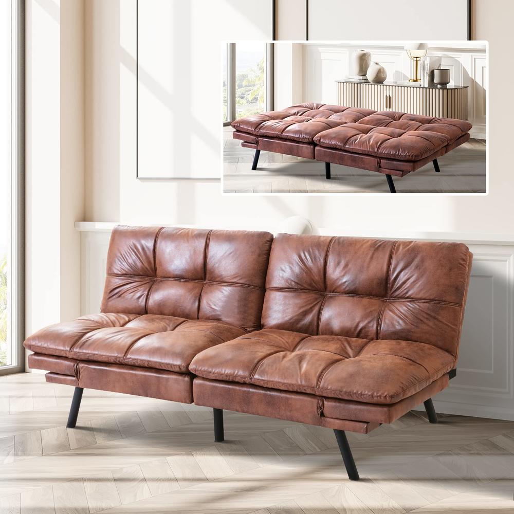 Opoiar Futon Sofa Bed Couch Sleeper Sofa Convertible Small Love Seat Memory Foam Brown Faux Leather Sofa For Living Room Apartme